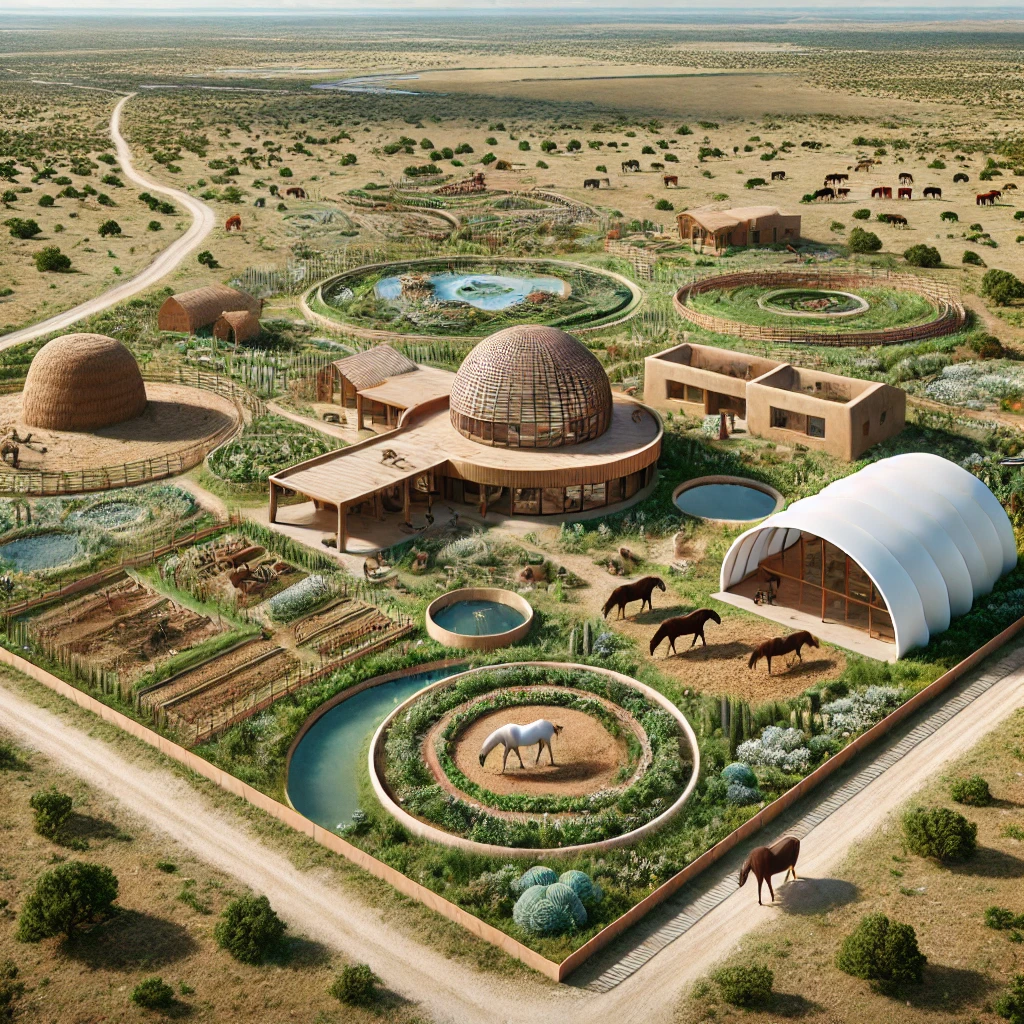 A large, sprawling ranch designed for rotational grazing, the ranch integrates adobe structures and ecological principles to support livestock and community members. The ranch’s design promotes biodiversity with food forests and animal habitats while the Silk Pavilion-inspired installations add artistic beauty to the natural landscape.